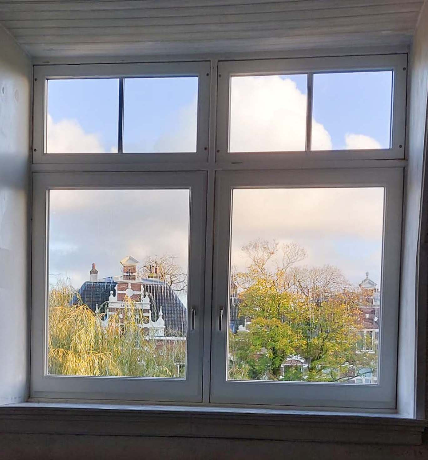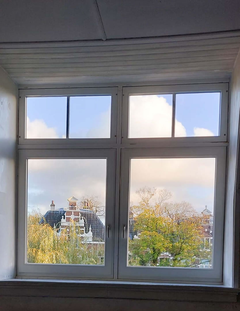 In de bestaande kozijnen hebben wij nieuwe stelkozijnen met draaikiepramen en vaste ramen geplaatst. De ramen zijn volledig nagemaakt naar het oorspronkelijke ontwerp. Bovenin elk kozijn is een vast bovenraam geplaatst met opplakroedes en een aluminium afstandhouder in het glas, net zoals vroeger. Onder dit bovenraam hebben wij draaikiepramen toegepast met modern beslag en HR++ glas. Zo blijft de uitstraling van het pand behouden, terwijl het comfort en de isolatie van deze tijd worden toegepast.